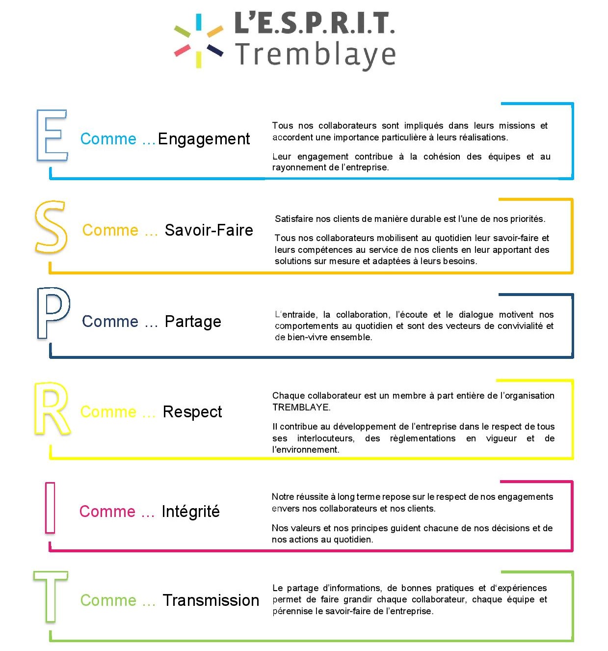 L' E.S.P.R.I.T. Tremblaye, c’est avant tout le fruit d’une réflexion collectivesur ce qui nous rassemble et ce que nous voulons vivre ensemble. C’est l’acronyme qui donne du sens à nos 6 valeurs d’entreprise.